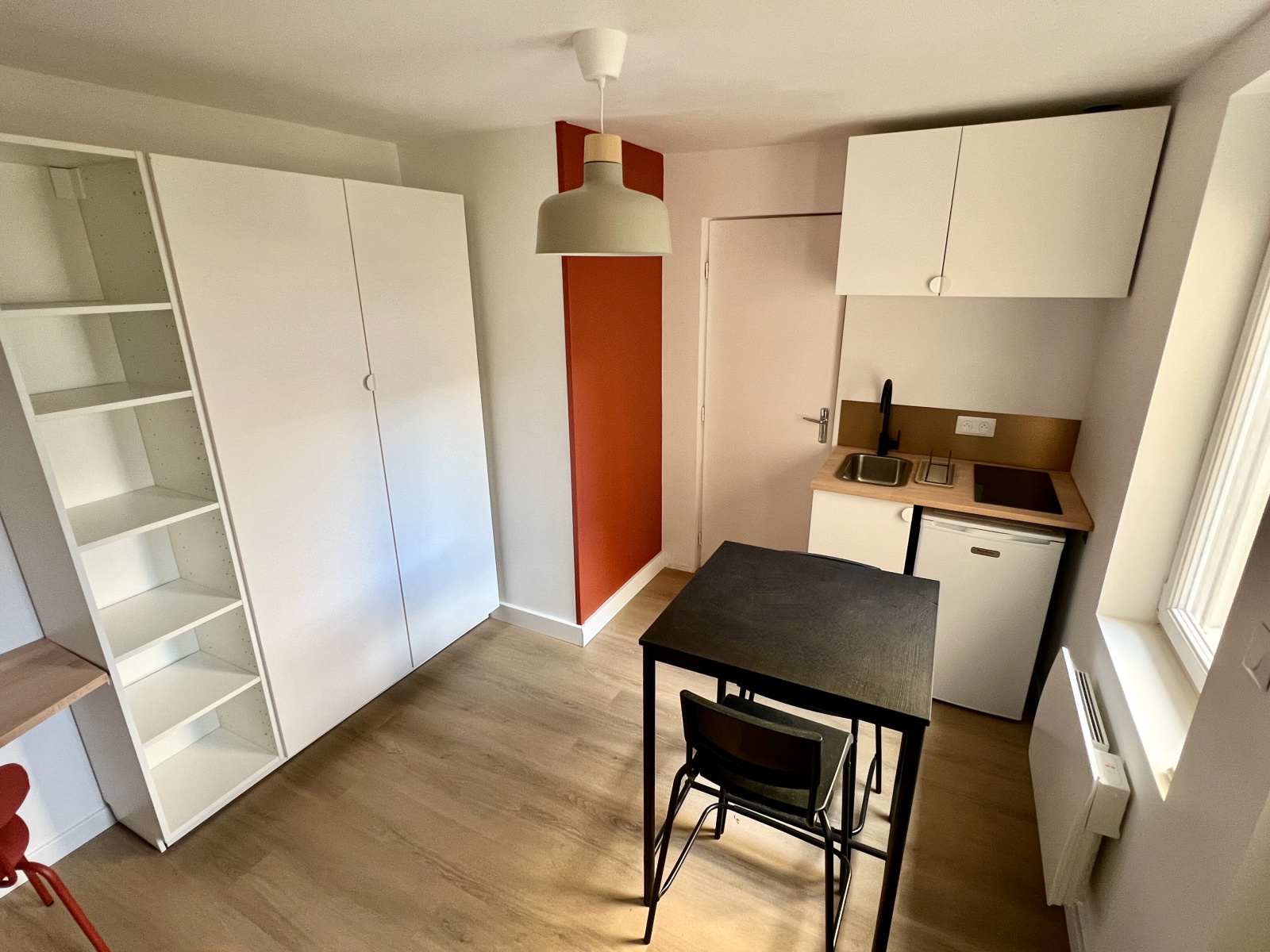 QUARTIER SABLON / CARNOT - Dans une résidence sécurisée - En rez-de-chaussée donnant sur une cour intérieure - Appartement T1 meublé et équipé, entièrement rénové et agencé par architecte, d'une surface habitable de 21,10 m²: Pièce de vie avec kitchenette équipée - Espace nuit avec rangements - Salle d'eau avec toilettes et espace buanderie.