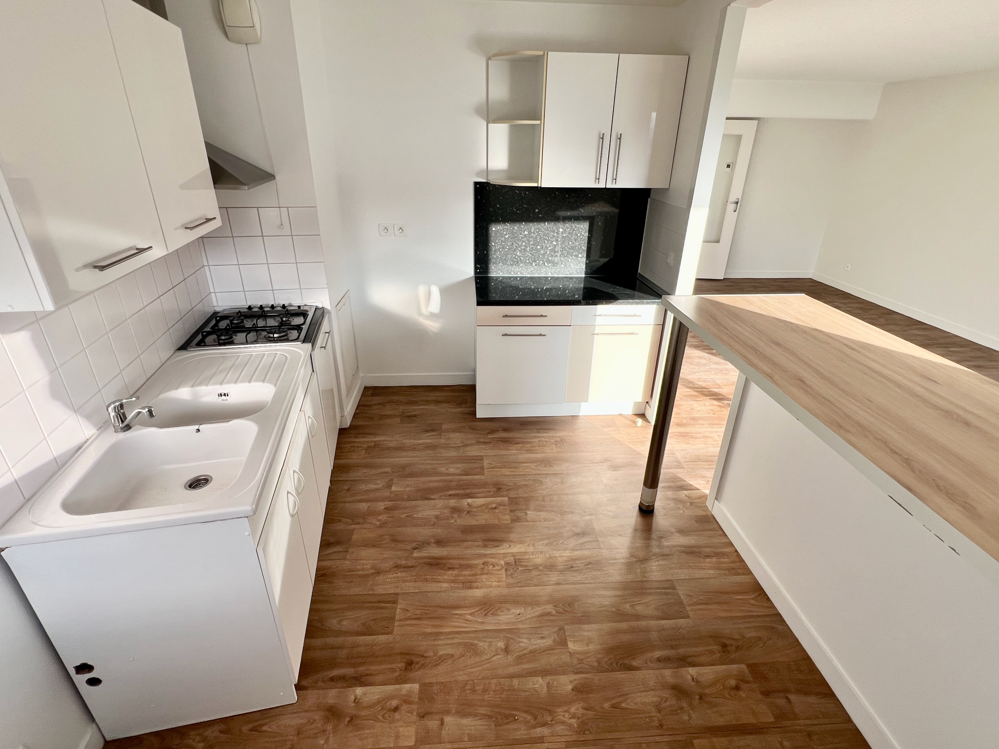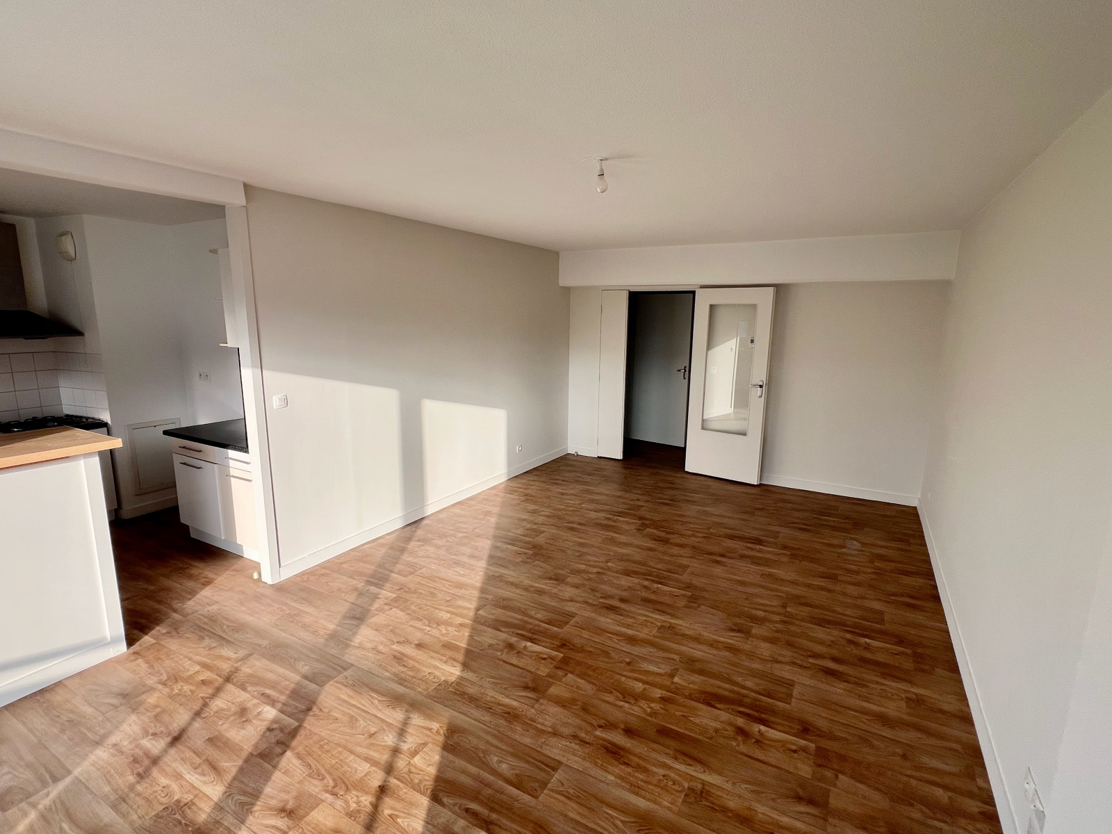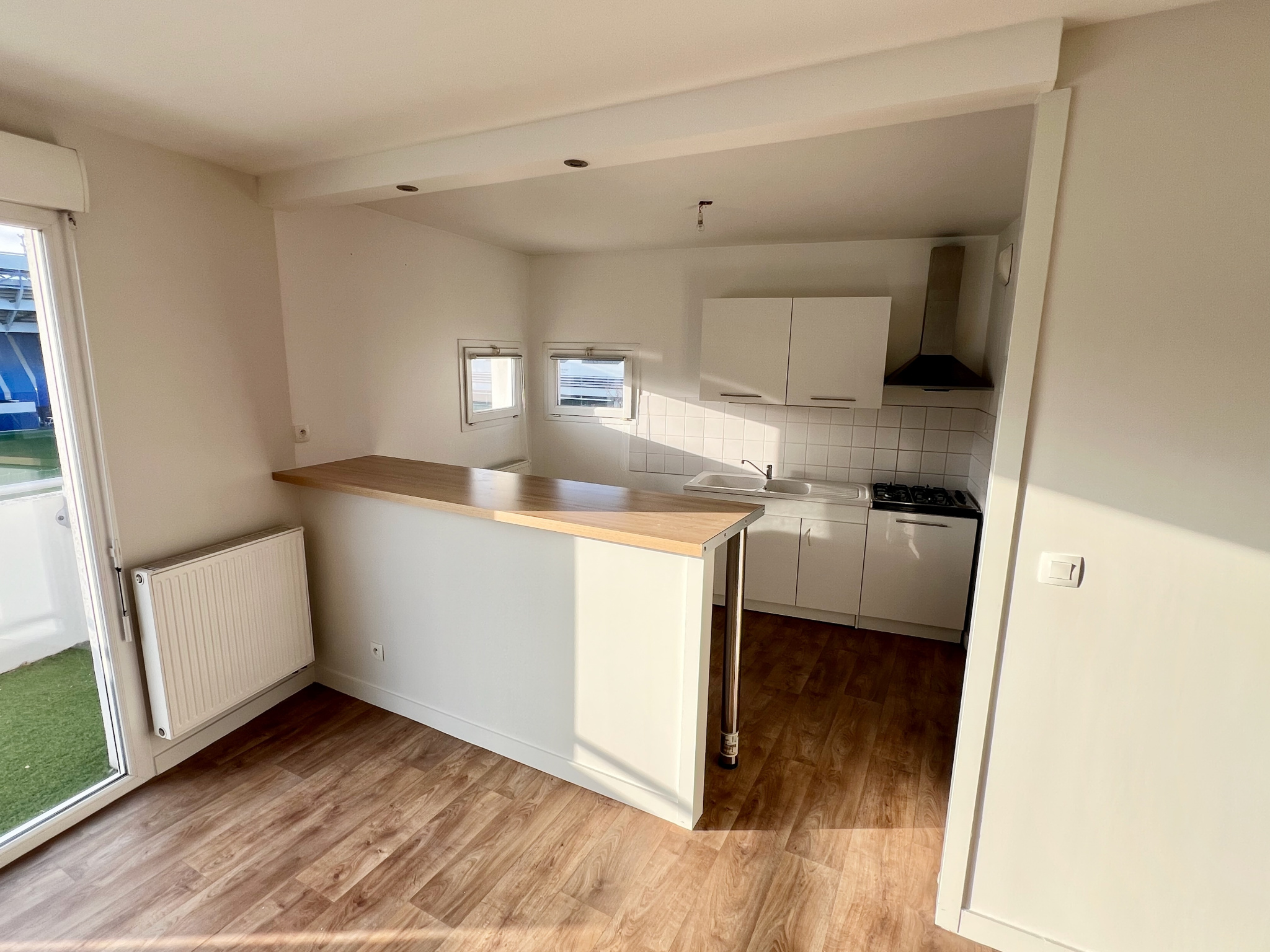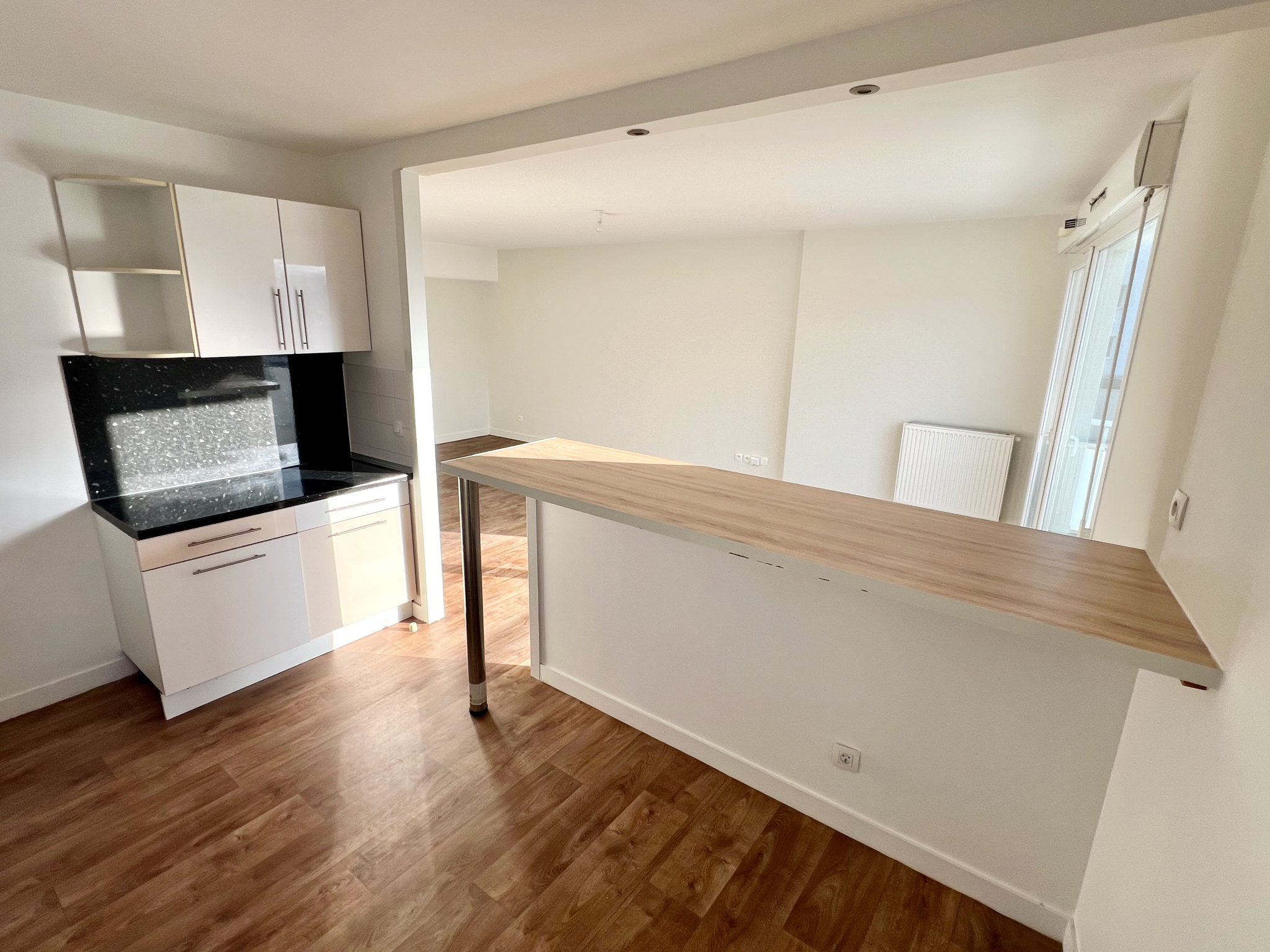 Entrée - Séjour / Salle à manger donnant sur balcon - Cuisine équipée US - 2 chambres dont une avec placards - Salle de bain - Toilettes - Buanderie - Garage.